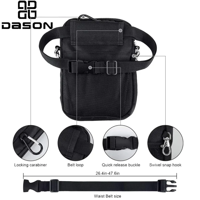 Den kan bruges som taljetaske, messenger-taske, skuldertaske eller hænges på bukser med en karabinhage.
