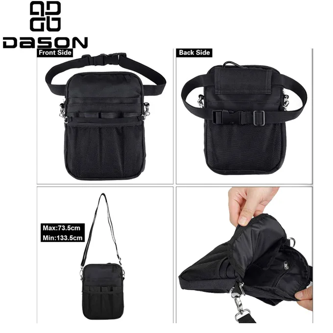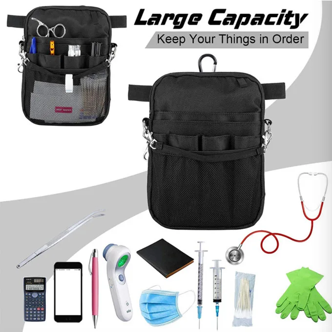 Nurse organizer tape funktioner er designet til at sikre præcision, bekvemmelighed og effektivitet. Denne medicinske plejetaske er perfekt til sundhedspersonale. Der er lommer i forskellige størrelser til kuglepenne, tuscher, termometre og lommelygter. Ekstra aftagelige skulderstropper foran med metalkroge til at holde medicinsk tape. Du kan også nemt vedhæfte en iPad mini, personsøger, medicinske handsker og stetoskop. , lommeregner, servietter, håndsprit osv. Sygeplejerske-remmen er også lavet af et rivefast polyester oxford-materiale, der er stærkt nok til at holde de redskaber, en sundhedspersonale har brug for, samtidig med at den er vandtæt og åndbar.